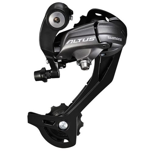 The Altus RD-M370 is a light action MTB rear derailleur for 9-speed shifting systems. It features a low profile concept with double servo-pantograph technology that improves adjustability and resists weather and contamination. The rear derailleur always keeps close to the cassette sprockets, allowing smooth and effortless gear changing. Wide link for durability and precise shifting.