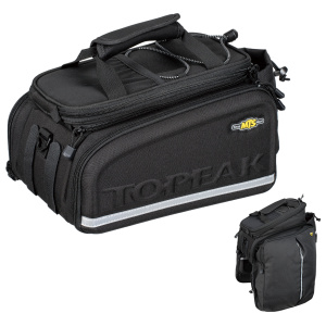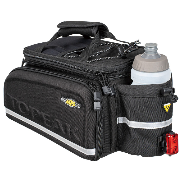 Dual molded side panels combine with flexible 600 denier fabric to form a semi-rigid, weather resistant trunkbag. Divided main compartment and side panels expand for extra storage capacity. Rear water bottle holder lets you carry more water on extended trips. Attaches to a rack with straps.