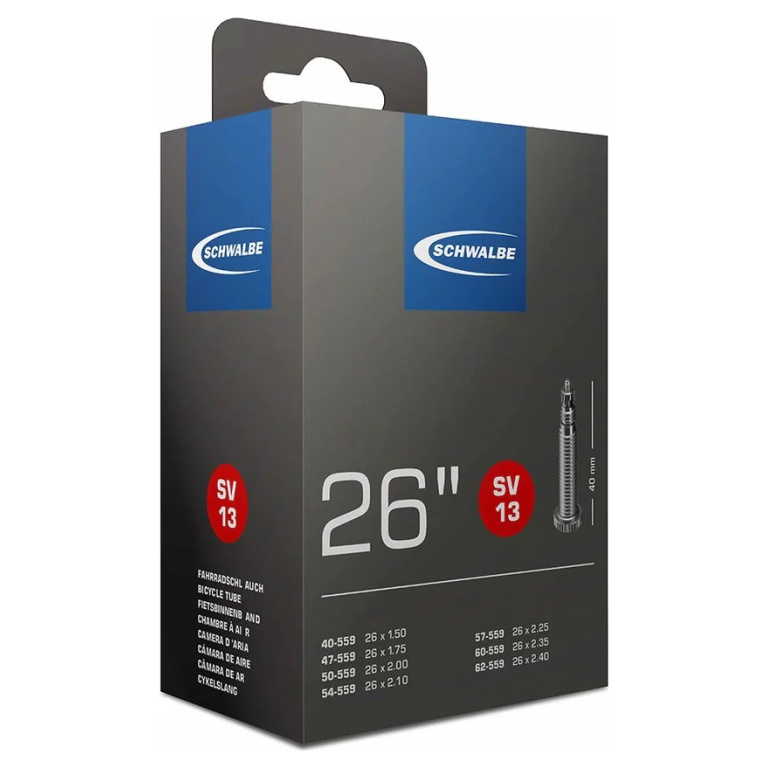 Schwalbe SV13 Inner Tubes are designed and manufactured to retain air pressure considerably longer than their competitors. Not only is each individual tube inflated and inserted into a mould to ensure that there is even wall thickness and excellent air retention, they are also stored under pressure for 24hrs to test air retention.